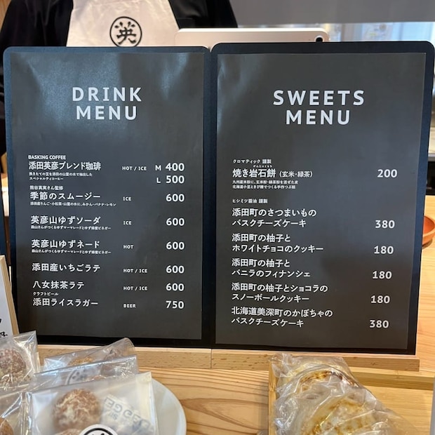 添田産の食材を使ったドリンクの他、ヒシミツやカフェクロマティックなど地元のお店のスイーツがいただけます。