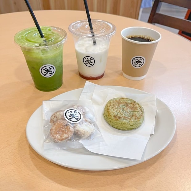 (左上から)季節のスムージー 600円・添田産いちごラテ 600円・添田英彦ブレンドコーヒー・ホットM 400円・添田町の柚子とショコラのスノーボールクッキー 180円・焼き岩石餅・緑茶 200円