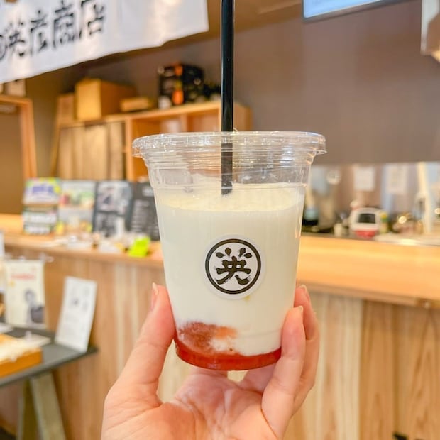 添田産のいちごをふんだんに使ったいちごラテは、好みの加減に混ぜて飲むのが楽しい一品。