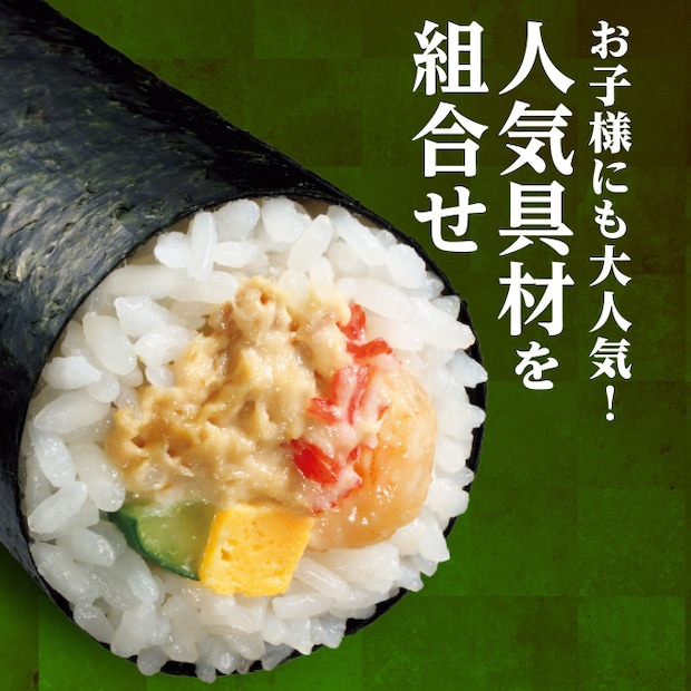 海老マヨネーズ和えとツナマヨネーズ和えに、厚焼き玉子、カニカマ、胡瓜を組み合わせたロングセラー商品。
