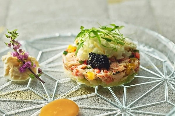 ジビエを使った香り高いアミューズから始まり、ズワイガニとキャベツのインサラータ。