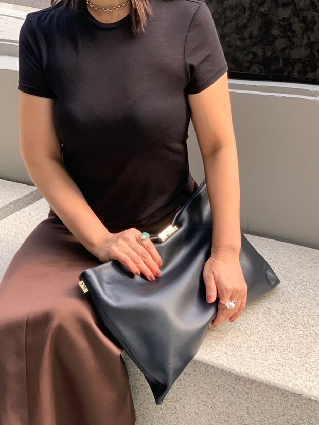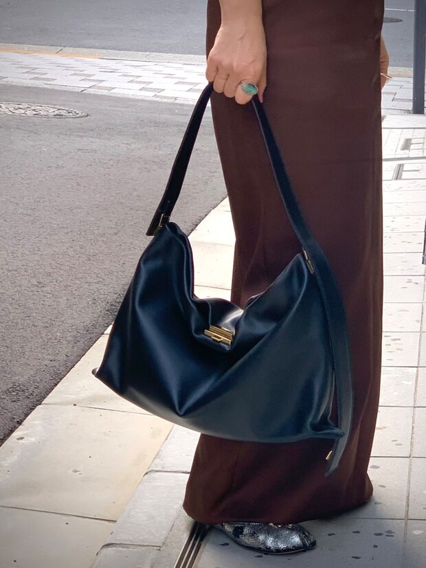 昨年オトナミューズの誌面でファッション業界人にアンケートを実施した際「今気になるバッグブランド」でランクインしていたブランド、PUNTI.(プンティ)。その後も多くのスタイリストさんがリースをされるのを横目で見つつ、ずーっと欲しいなあと思っていた3WAYトートをようやくゲット。クタッとしたレザーの質感に高級感のあるゴールドカラーの金具が付いているのみのミニマルなデザインがたまりません。もともとストラップは付けず、大きなクラッチバッグとして休日使いにと考えていたのですが、実際ストラップを付けて使ってみると、まあその便利なこと! ストラップの長さは2段階に調節でき、短めにして肩掛けやハンドバッグとして、長めにすればクロスボディにもなるので、私は小さめのノートパソコンを入れて通勤バッグにも活用したいなと思案中。