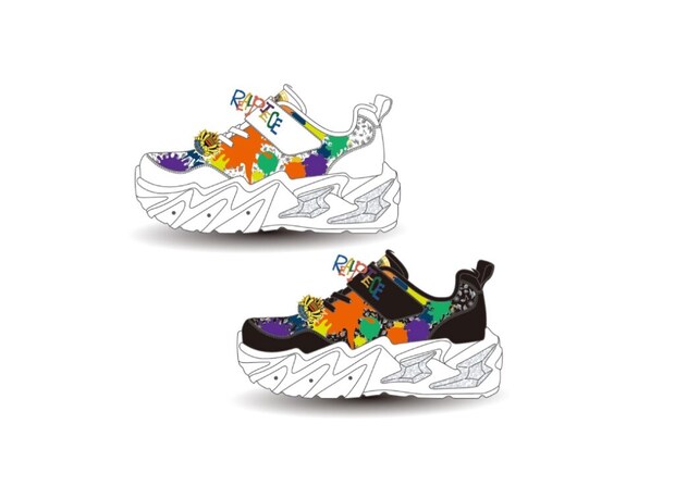 ペイント柄が特徴的。メンバーのイラストやアイコンがさりげなく入ったデザインに注目です。メンバーカラー調に光るLEDライトをソールに搭載しており暗い夜道も安心!
