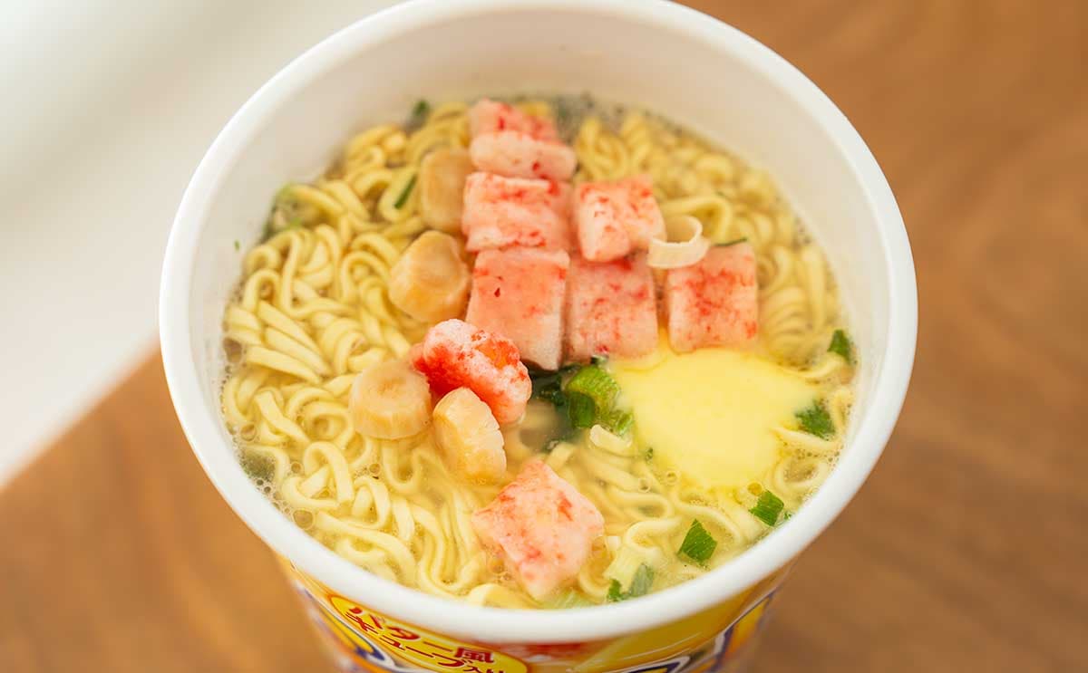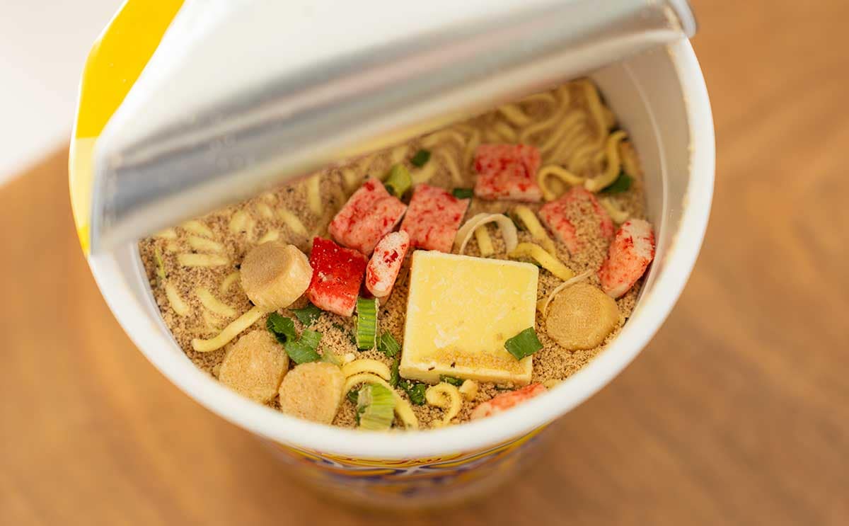 具材は、かに風かまぼことほたて風かまぼこ、ねぎの3種類。バター風キューブが溶けています。