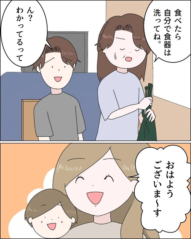 私も甘いなとは思いましたが、息子たちが引越してきて家のルールを作ったにもかかわらず、翌朝にさっそく息子に朝食をねだられて準備してしまいました。「食べたら自分で食器は洗ってね」と言う私に「分かってるって」と調子のよいショウ。その頃になってアミちゃんが起きてきました。
