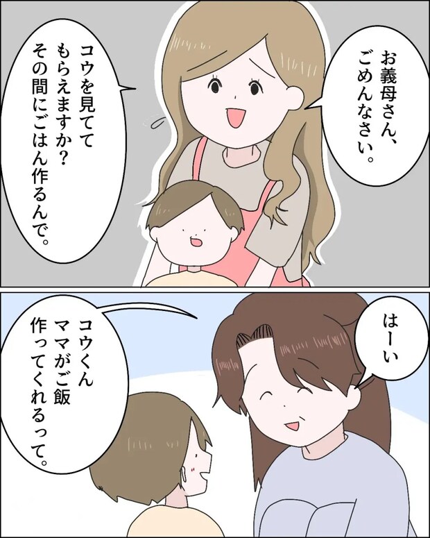 「お義母さんごめんなさい。コウを見ててもらえますか?その間にご飯作るんで。」とアミちゃんが言いました。そのくらいなら問題ないわ。私もかわいい孫と一緒にいられるから。