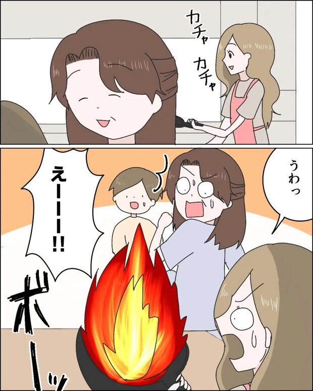 アミちゃんがフライパンを取り出してまもなく、「うわっ」という声と共に、炎が上がりました。何をどうしたらそうなるのよ!?