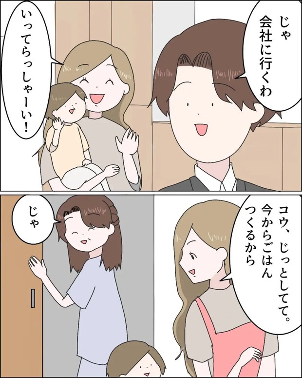 会社に行くショウを見送ったアミちゃんは「コウ、じっとしてて。今からご飯作るから」とコウくんに話していたので、「じゃ」と私は自分の部屋へ戻ろうとしました。すると。
