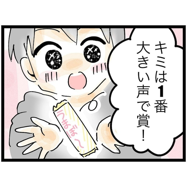 「大きい声で賞」のお菓子をもらい、目を輝かせるタク。その後も遊びながら身体を動かし、楽しい時間を過ごします。