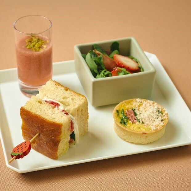セイボリーでは、いちごの風味を濃縮した「ストロベリーのガスパチョ」、甘酸っぱいいちごと濃厚なブッラータチーズの絶妙なマッチングが楽しめる「ストロベリー、ブッラータチーズ、バジルのフォカッチャサンドイッチ」など4種が用意され、ひと口食べ進めるごとに春の訪れを感じられる。