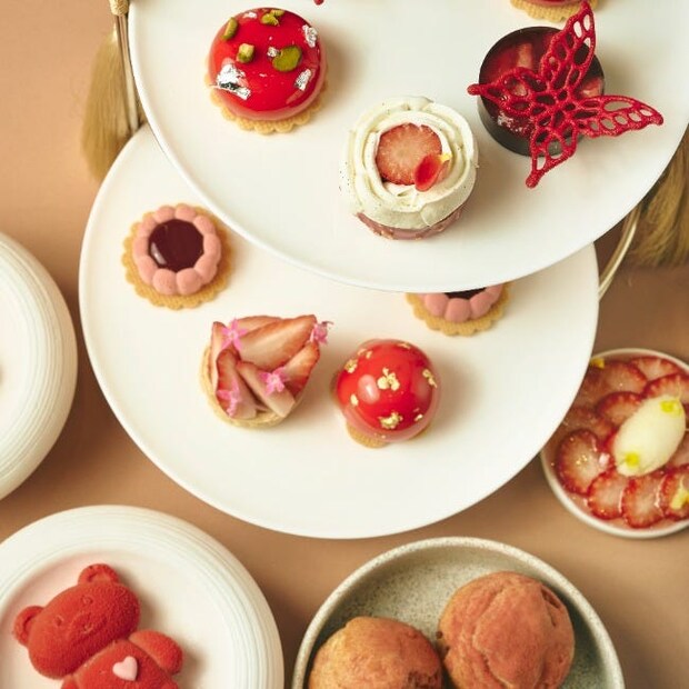 スイーツは、いちご本来の甘みが堪能できる「フレッシュストロベリーパイ」、深紅の蝶とチョコレートのコントラストが美しい「チョコレート・ベリータルト」、ローズゼリーといちごが奏でる繊細なハーモニーの「イスパハン」など、見た目も味わいも華やかな9種のアイテムがずらり。