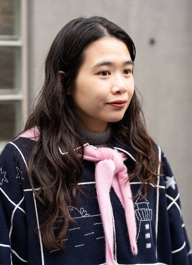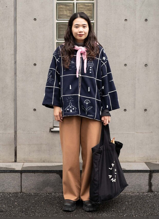 いまトレンドの三角ストールは、マフラーよりも気軽に使えるのが嬉しい! やさしげなピンクを選んで、挿し色にしたのがグッド!
