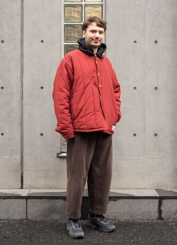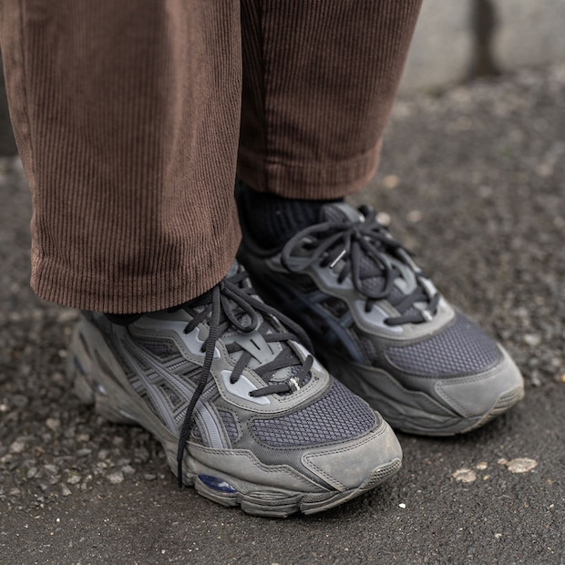 『アシックス』のスニーカーでスポーティテイストに味付け。ブラウンのコーデュロイパンツと合わせて、こなれ感ある足元に昇華!