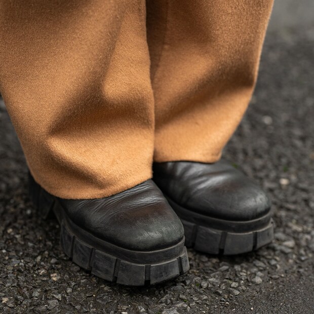 足元はボリューム感のあるレザーシューズをオン。あたたかなベージュボトムスをグッと引き締めてくれるアイテム。