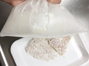 天ぷら粉やスパイスを混ぜた粉をポリ袋に入れ、むね肉を入れて振ります。