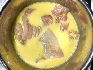 フォークで穴をあけた鶏むね肉を、卵液に1時間以上漬け込みます。