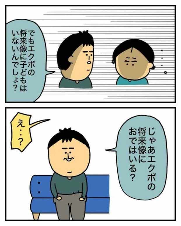 子どもが絶対欲しいとも、産んで欲しいとも言っていないよと言うとシゲオさんは、「エクボの将来像におではいる?」とエクボさんに質問をするのでした。