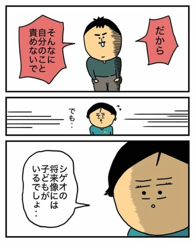 シゲオさんは、「理由を教えてなんて言ってないよ、それに絶対子どもが欲しいとも言ってないし、子ども産んでとも言ってないでしょ」とエクボさんを落ち着かせるように話します。そして、「そんなに自分のことを責めないで」とエクボさんを思いやるのでした。