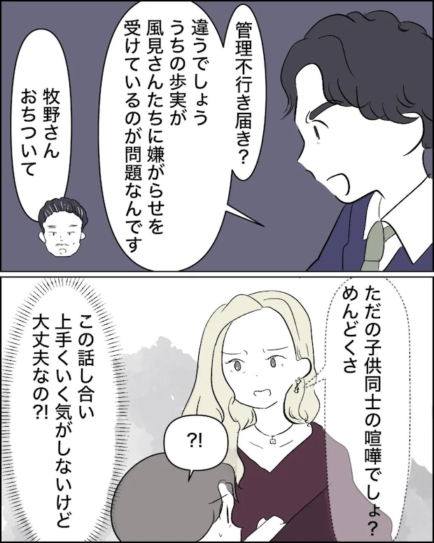 先生のいじめを濁すような言い方が気に障ったのか「管理不行き届き?違うでしょう、うちの歩実が風見さんたちに嫌がらせを受けているのが問題なんです」とハッキリ告げる博之。すると風見さんのお母さんが「ただの子ども同士の喧嘩でしょ?めんどくさ」と小さく吐き捨てるようにつぶやきました。私はその様子を見て、この話し合い上手くいくのかな・・・と不安な気持ちになります。