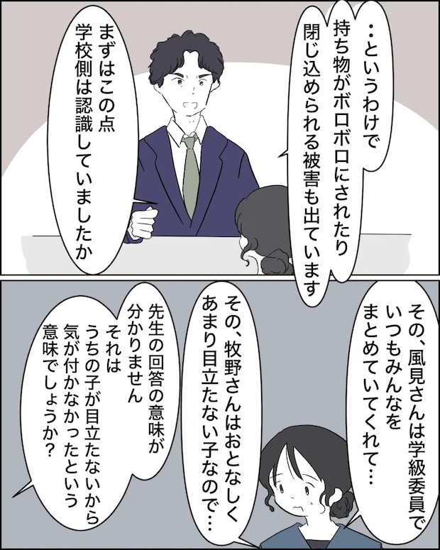 博之は、歩実が受けてきたいじめの数々を、ひとつずつ具体的に説明しました。そして話し終えると、担任の水原先生に視線を向け「この点、学校側は認識していましたか?」と問いかけます。しかし返ってきたのは、「その、牧野さんはあまり目立たない子なので・・・」という歯切れの悪い言葉。答えになっていない返しに、「それはうちの子が目立たないから気付かなかったという意味でしょうか?」と博之の口調が鋭くなります。