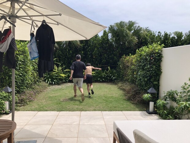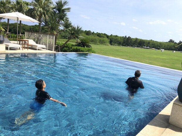 プールの向こう側はどこまでも続く芝生が広がっており、遮るものもなく、とても伸び伸びできます。これだけ広い芝生なのに、手入れが行き届いていて、見ていても気持ちが良いです。