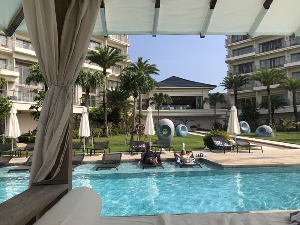 クラブインターコンチネンタル や ベイウィング に宿泊する方に一番近くて広いプールは、夕陽が綺麗に見られる「サンセットプール」。ベイウィングの中央から眺めるプールの景色がまた素晴らしいです。