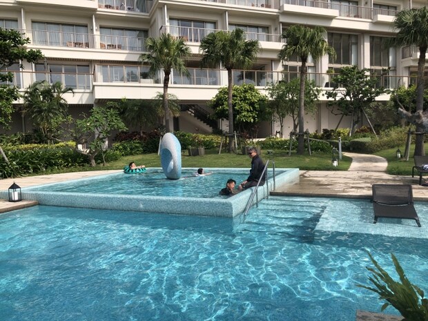 プールの深さは様々あり、小さなお子様から大人まで楽しめます。また、プールに置かれた椅子では日焼けを楽しむ人も。