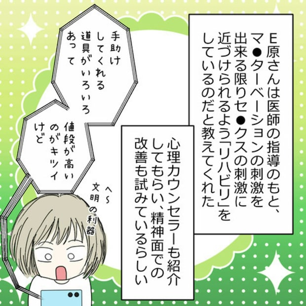 S葉さんが自分が原因なのかと悩む中、やがてE原さんが「膣内射精障害」だということがわかりました。E原さんは病気というわけではないと病院に行くことをためらいますが、S葉さんは彼を責めることなく、気持ちに寄り添いながら少しずつサポートしていきます。その姿勢がきっかけとなり、E原さんも自らの状況を受け入れ、専門の病院へ足を運ぶようになります。そこで、同じ悩みを持つ男性たちが少なくないことや、パートナーと一緒に治療に取り組むカップルもいることを知るのです。
