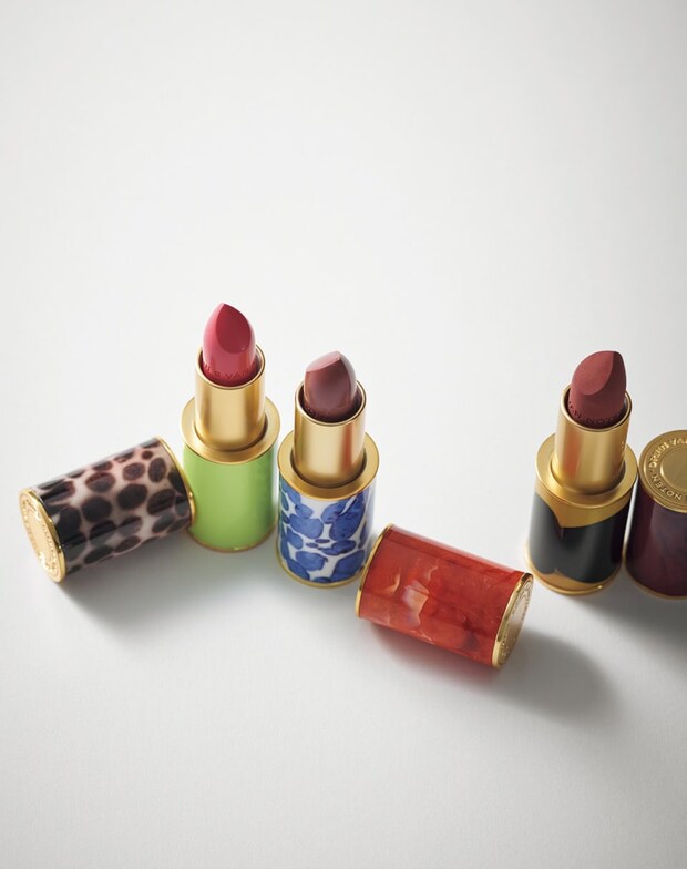 持っているだけで心浮き立つアートピースのような口紅ならこちら。ケースはメゾンのアーカイブテキスタイルなどから着想していて、2つの要素の対比が洒落感を加速させている。17番のマットブラウン、60番のフレッシュピンク、14番の赤みをおさえたストイックなヌード……いずれもひと塗りで顔立ちをモードに変えるパワーシェード。