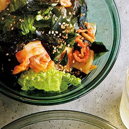 1 わかめは水に浸してもどし、水けをしっかり絞る。キムチはざく切りにする。レタスは食べやすい大きさにちぎり、韓国のりは小さくちぎる。