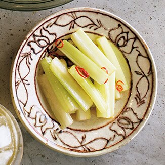1 セロリは筋を除いて5㎝の長さに切り、1㎝幅に切る。塩をふって10分おき、水けをペーパタオルでふく。