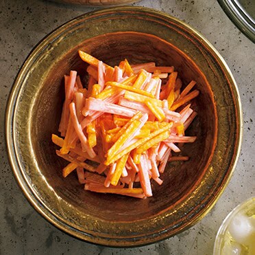 にんじんをカラムーチョと同じ細さに切って一体化させてください。食欲をそそるスパイシーな風味に、ハマる人が続出する一品