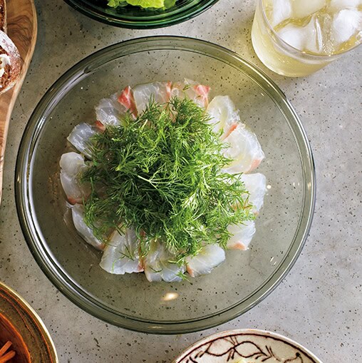 器に刺し身を盛り、ディルをのせる。レモンのしぼり汁、オリーブ油をかけ、塩をふる。