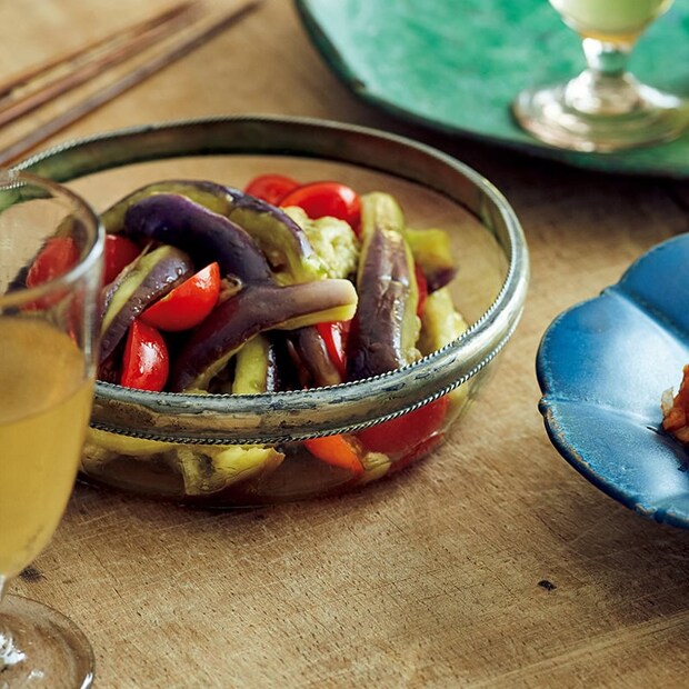 1 なすはへたを除いて皮をピーラーで縞目にむき、水にさっとくぐらせる。耐熱皿に並べてふんわりとラップをかけ、電子レンジ(600W)で5分加熱する。ラップをしたまま粗熱を取り、手で食べやすくさく。プチトマトは半分に切る。