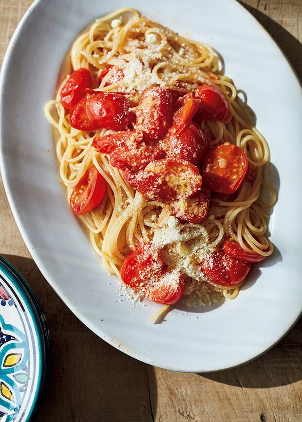 2 フライパンにオリーブ油、にんにくを入れて弱火で熱し、香りが立ったらミニトマトを入れる。皮がはがれてくるまで1〜2分炒め、塩少々、1のゆで汁1/4カップ(50㎖)を加え、全体がなじんだら火を止める。