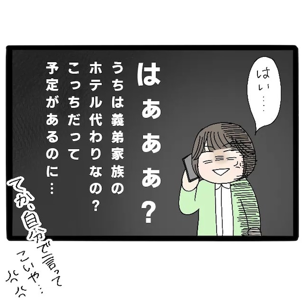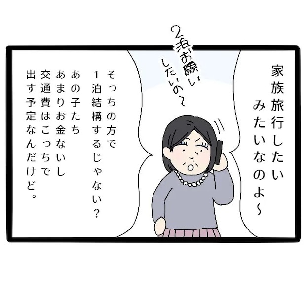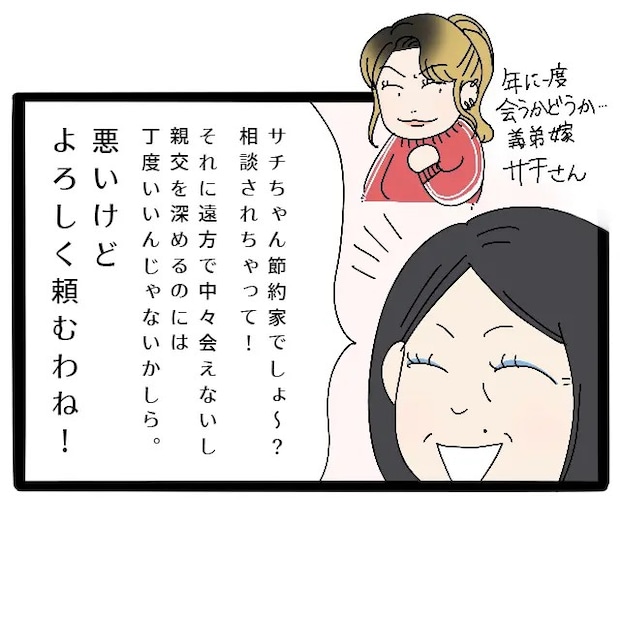 節約家だという、ほとんどやり取りの無いサチさんがお義母さんに相談したのだと義母は嬉しそうに説明したうえで、なかなか会えない義弟家族と親交を深めるのにはちょうど良いと勝手なことを言って「悪いけどよろしく頼むわね!」と決定事項のように言い放ちました。