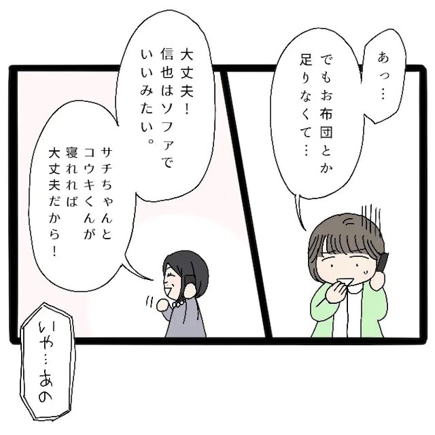 私は布団が足りないとやんわり断ろうとしましたが全く通用しませんでした。信也君はソファで寝ると勝手に決められ、信也君の奥さんサチさんと息子コウキくんが寝られれば大丈夫と押し切られてしまいました。