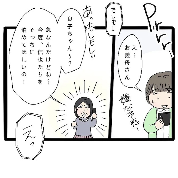 夫達也の弟信也君たち家族を泊めてほしいというお義母さんの言葉に、予感は的中したと思いました。結婚して子供もいる信也君のことを未だに甘やかしているお義母さん。言葉の調子から断れる感じではなさそうだなと憂鬱になりました。