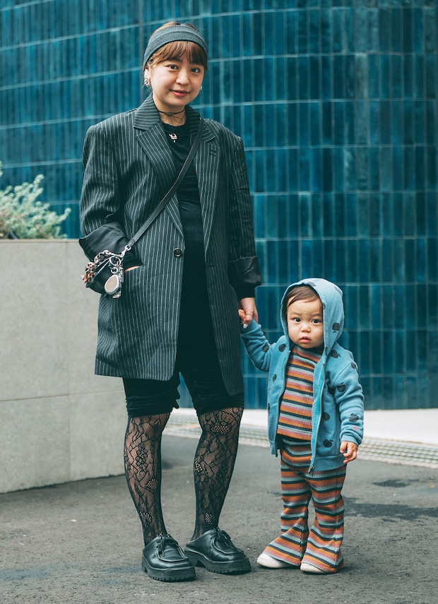 「ママはカプリパンツ×レースタイツの合わせが今年っぽいですね! ダークトーンのコーデもレースタイツを投入していて抜け感があります。お子さんとはよく見るとストライプとボーダーでさりげなくリンクしていますね。アイスブルーやマルチボーダーが、ママのブラックコーデに映えてて可愛いです!」