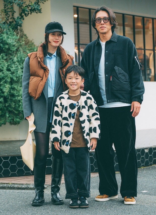 「ブラウンやブラックをリンクしつつ、ママのブルーが効いていますね。息子くんの柄アウターは、家族コーデのアクセントに! パパとはボア素材がリンクしていますね。ママはジャケットの上にダウンベストを合わせて、カジュアルダウンしているところがお上手。シアーなタイツは抜け感に!」