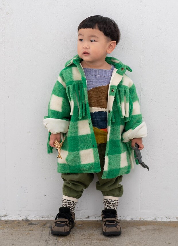 アーティな柄のニットにモスグリーンのパンツを合わせたダンくん。主役にしたのは、レトロなグリーン×ホワイトチェックのアウター。厚手素材のほっこり可愛いムードが魅力。さらに袖や胸元にあしらわれたフリンジが動くたびに存在感を放つナイスなアクセントに! 足元にレオパード柄の靴下をプラスすれば遊び心も。