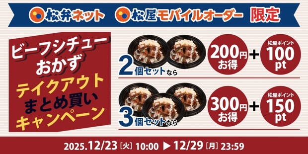 期間中、松弁ネットおよび松屋モバイルオーダーにて、対象メニューを注文すると、2個セットで100ポイント、3個セットで150ポイントの松屋ポイントを付与する。なお、松弁デリバリーは対象外。