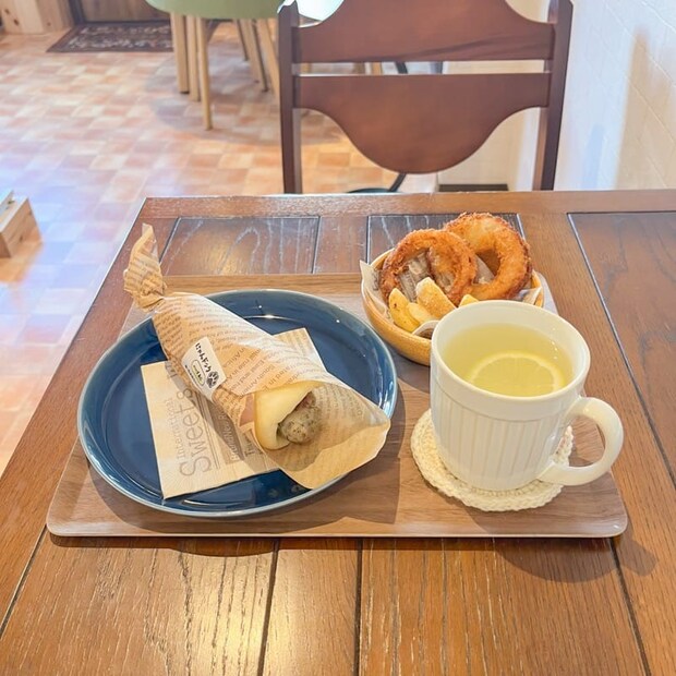 今回は店主さんおすすめの手作りナンドッグ・ハーブをCセットで、サイドはポテトオニオン、ドリンクはホットレモネードでいただきました♪