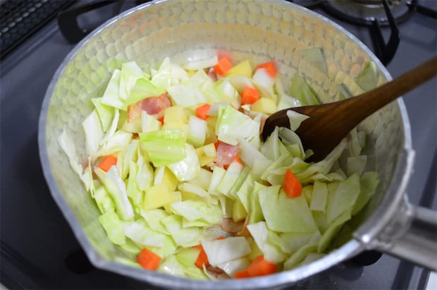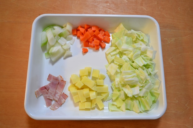 1. ベーコンは1cm幅に切る。キャベツは2cmの角切り、じゃがいも、玉ねぎ、にんじんは1cmの角切りにする。