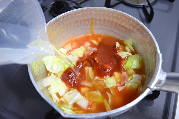 それではまず、「デルモンテ 洋食おまかせ」トマトソースを使って、ミネストローネを作ります。