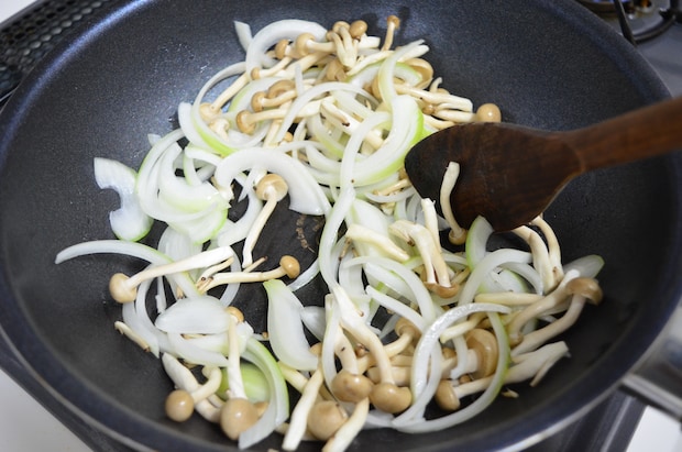 2. フライパンに油を中火で熱し、玉ねぎ、しめじを炒める。玉ねぎが透き通ってきたら牛肉を入れてほぐしながら炒める。