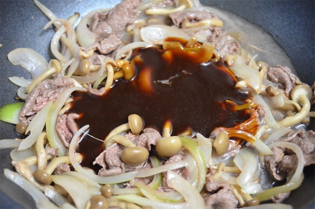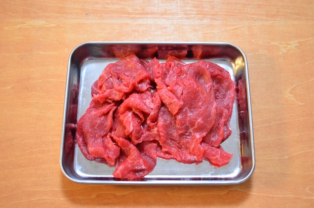 1. 玉ねぎは薄切りにし、しめじは根元を切り落としてほぐす。牛肉は食べやすい大きさに切る。