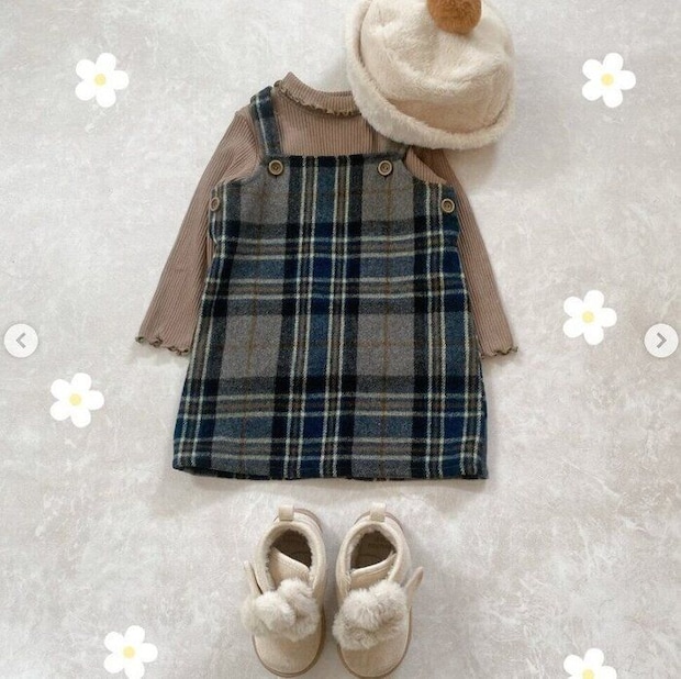 こちらのコーデは、__koha_3_momさんが海外子ども服で組んだもの。花の刺しゅうが可愛い淡色ニットを主役にし、チェック柄のワンピースを合わせたんだそうです♪ とっても上品な雰囲気で、お正月コーデにもぴったりですね◎