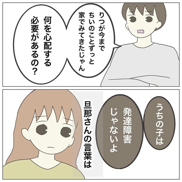 はちみつこさんのお友達りっちゃんは、子どものちいちゃんの発達について心配があります。医師からの指摘も受けて5歳児健診に行こうと考えますが、「うちの子は発達障害じゃない」と決めつける夫に反対され断念。でも、ちいちゃんと過ごす日常の中で、徐々に違和感を覚えるりっちゃん。それについて一番相談したいのは夫だけれど、夫との関係にも溝ができ始めていました。