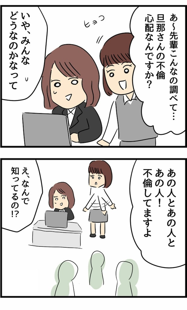 夫に不倫されてしまったリナさん。離婚を切り出すも、決着がつきませんでした。重い気持ちを引きずったまま出社したリナさんは、まわりの人も疑いの目で見てしまいます。すると、後輩から「あの人とあの人、不倫してますよ」と告げられます…。